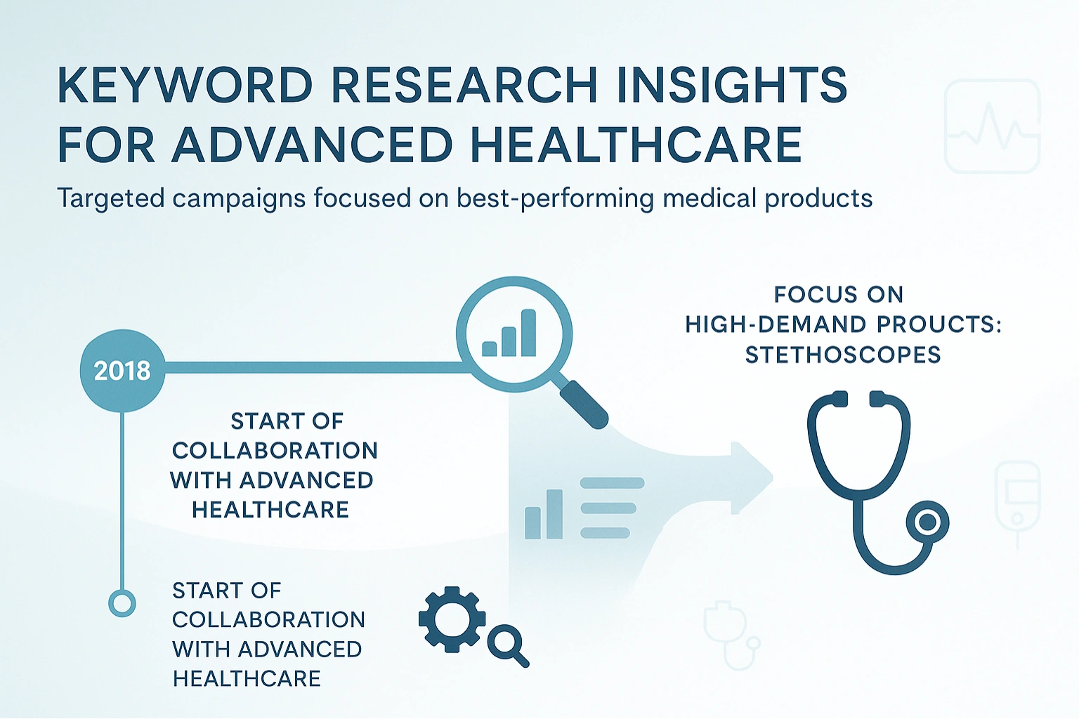 Η συνεργασία μας με την Advanced Healthcare ξεκίνησε το 2018, σε μια εποχή που τα εργαλεία ψηφιακού μάρκετινγκ ήταν λιγότερο προηγμένα. Αρχικά, ο πελάτης μας ενημέρωσε για τα προϊόντα που διέθετε ήδη στο κοινό του και βασίστηκε στα δεδομένα που είχαμε προκειμένου να κάνουμε ανάλυση λέξεων-κλειδιών (Keyword Research). Το σημαντικότερο εύρημα ήταν η ανάγκη για στοχευμένες καμπάνιες στα ήδη δημοφιλή προϊόντα, όπως τα στηθοσκόπια, γεγονός που μας οδήγησε στο να εστιάσουμε την προσπάθεια στα πιο αποδοτικά εμπορεύματα της εταιρείας.