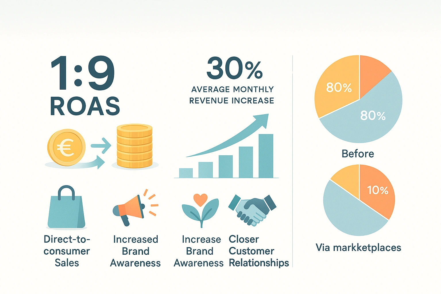 Η εφαρμογή αυτής της σταδιακής, οργανωμένης στρατηγικής απέφερε εντυπωσιακά αποτελέσματα. Οι διαφημιστικές καμπάνιες πέτυχαν μια εξαιρετική απόδοση επένδυσης (ROAS) της τάξης του 1:9, κάτι που σημαίνει πως για κάθε ευρώ που δαπανούσε στις διαφημίσεις, η εταιρεία κέρδιζε εννέα ευρώ ως έσοδα. Επιπλέον, σημειώθηκε μέση μηνιαία αύξηση του τζίρου κατά 30%, γεγονός που αποδεικνύει τη δυναμική επίδραση της διαφοροποίησης.