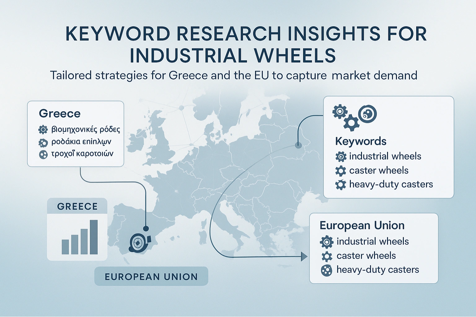 Αρχίσαμε με μια λεπτομερή έρευνα λέξεων-κλειδιών (Keyword Research), η οποία έδειξε ξεκάθαρα μια ενεργή ζήτηση για βιομηχανικούς τροχούς τόσο στην Ελλάδα όσο και στις χώρες της Ευρωπαϊκής Ένωσης. Κατόπιν αυτής της έρευνας, διαμορφώσαμε ένα πρόγραμμα στρατηγικής στόχευσης για διαφορετικά keywords, ανάλογα με τη γεωγραφική θέση του κοινού. Προσεγγίσαμε την ελληνική και διεθνή αγορά χωριστά, εξασφαλίζοντας πως κάθε αγορά καλύπτεται με συγκεκριμένες και προσαρμοσμένες λέξεις-κλειδιά.