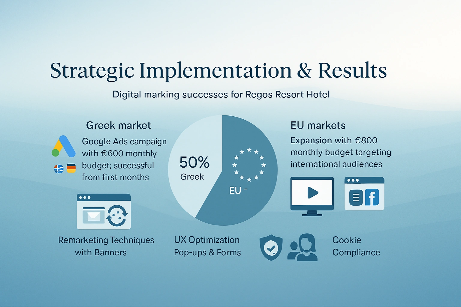 Η εφαρμογή της νέας στρατηγικής ξεκίνησε με μια καμπάνια Google Ads για την ελληνική αγορά, χρησιμοποιώντας προϋπολογισμό ύψους €600 τον μήνα. Η καμπάνια αυτή σημείωσε επιτυχία από τους πρώτους κιόλας μήνες και επέτρεψε την επέκταση της διαφήμισης στις διεθνείς αγορές, συγκεκριμένα στις χώρες της Ευρωπαϊκής Ένωσης, με ένα συμπληρωματικό προϋπολογισμό €800 τον μήνα. Έτσι, διαμορφώθηκε μια διττή στρατηγική που στόχευε διαφορετικά κοινά, αποδίδοντας θετικά αποτελέσματα και στις δύο περιπτώσεις.